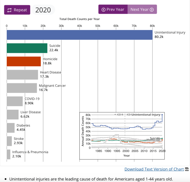For unintentional injuries, a category which includes opioid overdoses (unintentional poisoning), motor vehicle crashes, and unintentional falls, these unintentional injuries are the leading cause of death for Americans ages 1 – 44. The total number of unintentional injuries for 2020 was 80,200 well above year 2019’s 63,000. Also, suicides which became the second leading cause of death for Americans and steadily on the rise since 2012 reached a grim high in 2020 of 22,4000. And finally homicide as an injury category moved up to the 3rd leading cause of death for this age group with 18,800 recorded in year 2020.